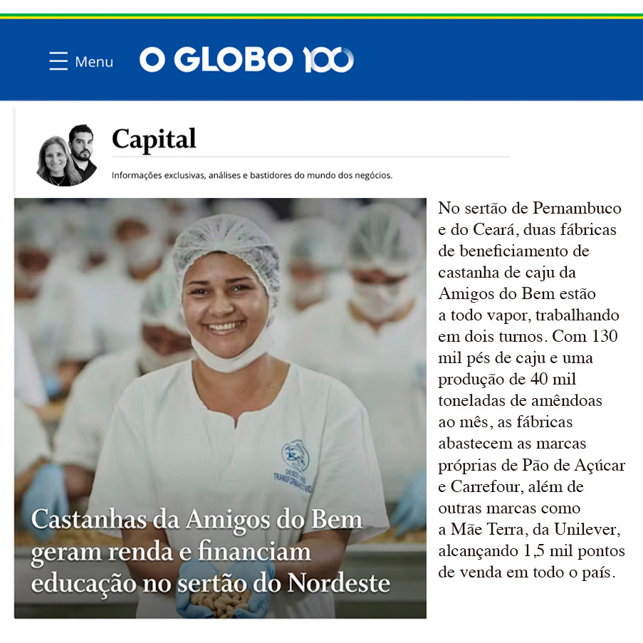 No sertão de Pernambuco e do Ceará, duas fábricas de beneficiamento de castanha de caju da Amigos do Bem estão a todo vapor, trabalhando em dois turnos. Com 130 mil pés de caju e uma produção de 40 mil toneladas de amêndoas ao mês, as fábricas abastecem as marcas próprias de Pão de Açúcar e Carrefour, além de outras marcas como a Mãe Terra, da Unilever, alcançando 1,5 mil pontos de venda em todo o país.